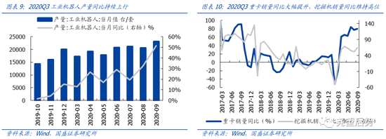 一季度受疫情影響,機(jī)械下游需求大幅下滑,隨著疫情的緩解,國(guó)內(nèi)經(jīng)濟(jì)逐步修復(fù),順周期板塊景氣向上——重卡和挖掘機(jī)銷(xiāo)量同比增速9月分別回升至80.2%和64.8%,工程機(jī)械未來(lái)需求有望延續(xù);另外隨著制造業(yè)景氣的回升,企業(yè)自動(dòng)化需求也大幅提升,工業(yè)機(jī)器人銷(xiāo)售增速持續(xù)上行,9月增速達(dá)到51.4%;另外,由于新能源概念的高景氣度,光伏設(shè)備及鋰電設(shè)備將維持高速增長(zhǎng)。整體來(lái)看,繼續(xù)看好機(jī)械設(shè)備板塊未來(lái)的業(yè)績(jī)?cè)鲩L(zhǎng)。