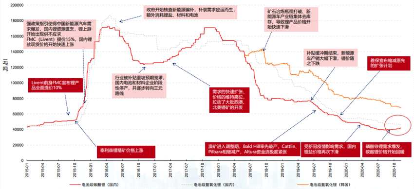 接下來,由于新能源汽車需求的增加,鋰金屬板塊將迎來一個更為樂觀的基本面。長江證券鋼鐵有色研究小組在研報中就指出,目前已經(jīng)來到了新周期的起點。2015年新能源汽車需求在強政策指引下爆發(fā),鋰供不應求,迅速提價;隨著2016年政府開始核查新能源騙補以及補貼退坡預期的來臨,鋰的需求預期也開始下降;在2019年補貼緩沖期結束,新能源車的銷量大幅下滑,鋰價也隨之下跌,今年的新冠疫情給鋰價帶來了二次沖擊。