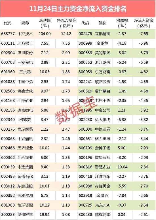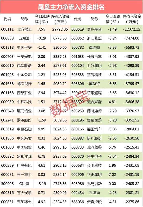 尾盤北方稀土資金流入2.98億元居首,公司股價尾盤一度沖擊漲停,值得關注是,公司近日公告第二大股東累計減持公司股份3600萬股,減持總金額為4.29億元。五糧液尾盤資金流入超6000萬元。貴州茅臺尾盤流出資金1.24億元,浙江龍盛流出資金超7000萬元。