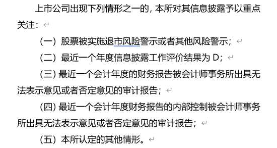 重點公司方面,上交所將4類公司納入范圍,對其信息披露事項進(jìn)行重點關(guān)注。主要包括股票被實施風(fēng)險警示、年度信披評價為D、年報被出具無法表示意見或否定意見、年度內(nèi)控被出具無法表示意見或否定意見等。