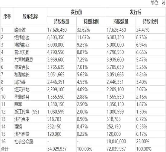 在11月18日披露的招股說明書中,果麥文化發(fā)行人共15名股東,其中,自然人股東為4名,分別為路金波、周巧蓉(韓寒母親)、薛軍和譚娟。其余11名非自然人股東包括經(jīng)緯創(chuàng)達(dá)、普華天勤、和諧成長、經(jīng)天緯地、果麥合伙、博納影業(yè)、浙江傳媒等。