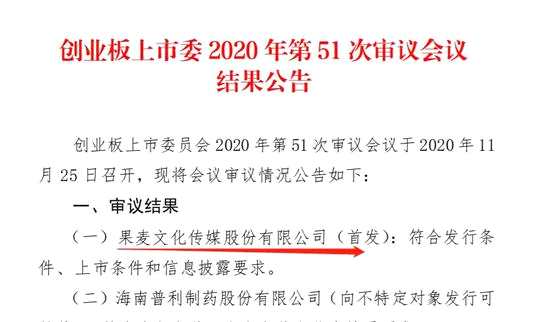 11月25日,果麥文化傳媒股份有限公司將正式上會。今日晚間,深交所創(chuàng)業(yè)板上市委公告,果麥文化首發(fā)通過。