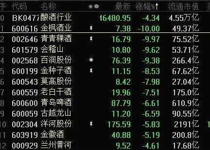 釀酒熱門股金楓酒業(yè)早盤低開后不久跌停,收盤時封單金額13.5萬手,約合資金1億元。該股11月以來最大漲幅達(dá)到80%以上,昨日創(chuàng)下年內(nèi)高點。釀酒股青青稞酒、會稽山、金種子酒、老白干酒、百潤股份等大熱股也出現(xiàn)大跌情況。