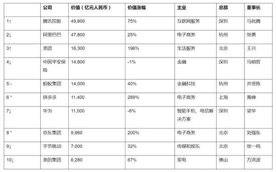 去年榜單的前十名分別是:阿里巴巴、騰訊控股、中國平安保險、華為投資控股、螞蟻金服、美團點評、字節(jié)跳動、恒瑞醫(yī)藥、美的集團、滴滴出行。