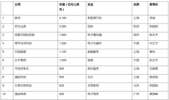 新上榜價值前十的企業(yè)