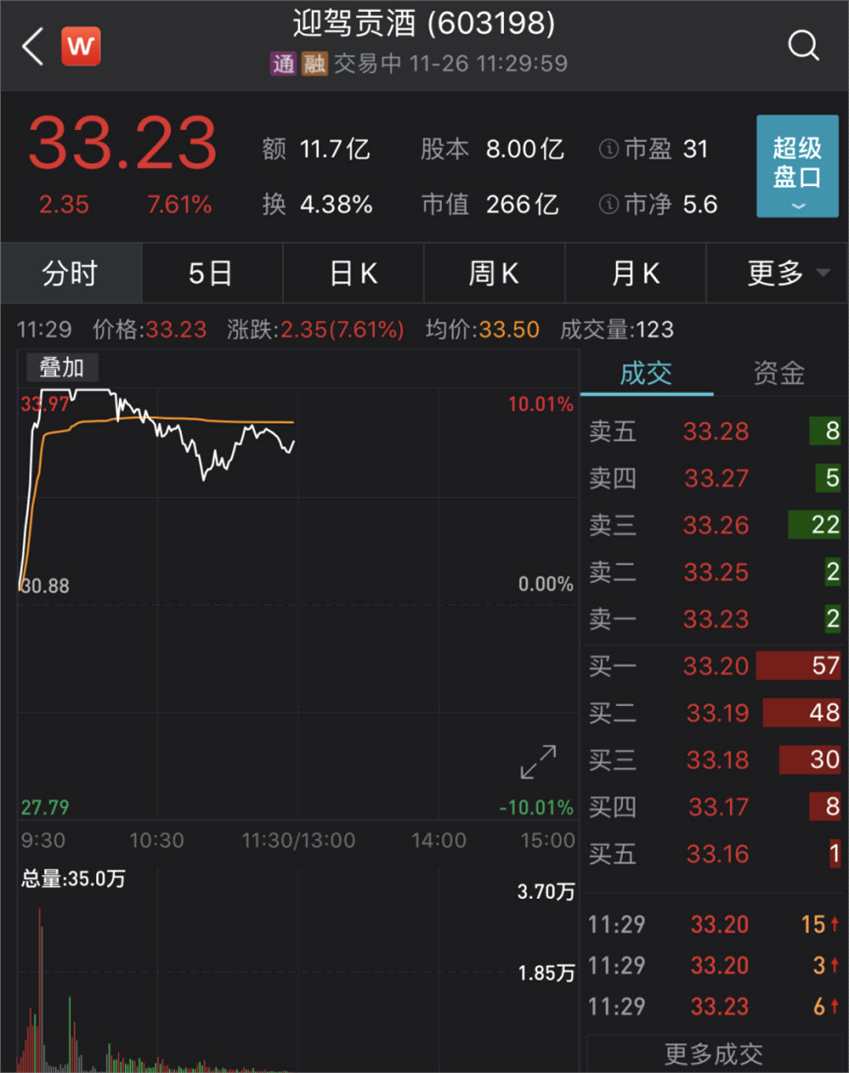 小酒股中,迎駕貢酒盤(pán)中漲停,至上午收盤(pán)上漲7.61%,總市值為266億元,半日成交額為11.7億元,換手率為4.38%。