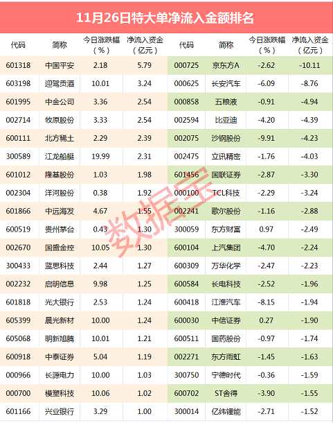 今日有12只個股特大單凈流出超2億元,面板龍頭京東方A全天特大單凈流出10.11億元居首。11月25日,京東方A發(fā)布公告稱,公司已獲得南京中電熊貓平板顯示科技有限公司部分股權(quán)的最終受讓資格。緊隨其后是長安汽車和五糧液,全天特大單凈流出分別為8.76億元和4.94億元。