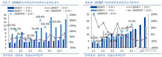 新能源汽車在疫情緩和之后,兩大主要銷售地區(qū)中國和歐洲均出現(xiàn)需求拐點,國內(nèi)新能源車9月單月銷量回升至13.8萬輛,同比增速達到72.5%,歐洲新能源車9月單月銷量回升至16.6萬輛,同比增速達到183.0%,后續(xù)有望維持高增長。