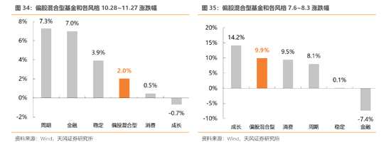 預計基金對周期、金融的配置仍然較低,未來可能出現(xiàn)存量資金轉移至順周期、大金融資產。由于基金重倉持股季度為頻率發(fā)布,我們通過偏股混合型基金來判斷基金目前持倉狀況。10.28~11.27市場風格明顯偏周期和金融風格,偏股混合型基金僅獲得2.0%的收益率,與市場偏好風格的收益率差距略大。對比此前7.6~8.3偏消費和成長的市場風格,偏股混合型基金獲得9.9%的收益率,與市場偏好風格收益率基本一致。而這兩段時間市場以震蕩為主,基金倉位不太可能大幅下降,因此我們判斷目前基金倉位主要還是以消費和成長為主,預計周期、金融的配置仍然較低,未來可能出現(xiàn)存量資金轉移至順周期、大金融資產。