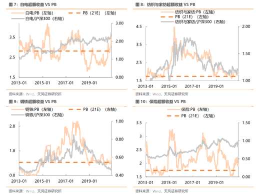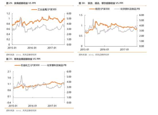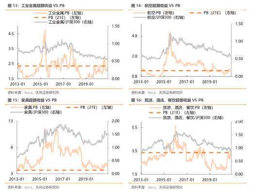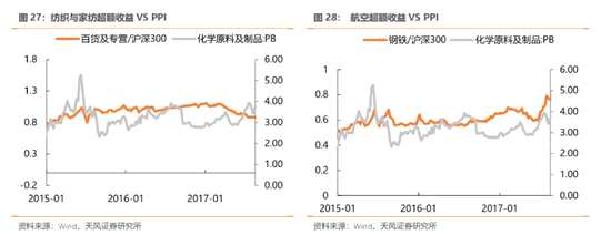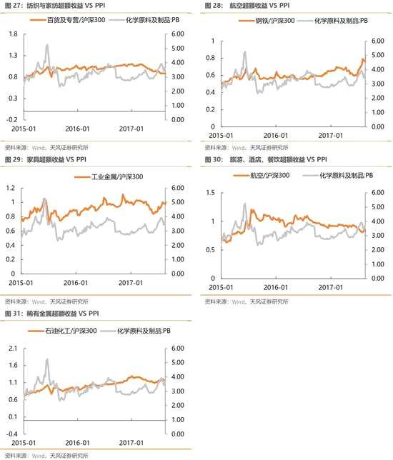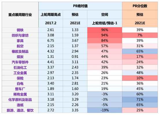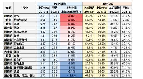 ?。?)從PB絕對值角度:鋼鐵、家紡、家具、航空、橡膠、煤炭、汽車零部件、石油化工的PB估值距離上輪PPI回升周期仍有一定差距,存在提估值空間。