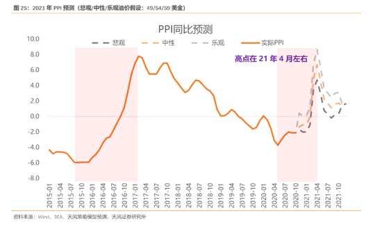 未來半年是PPI持續(xù)回升的窗口期。根據我們預測,雖然PPI回升的過程中存在諸多不確定因素,例如疫苗、全球經濟、油價等,但PPI的方向明確,且高點基本在明年4月左右。