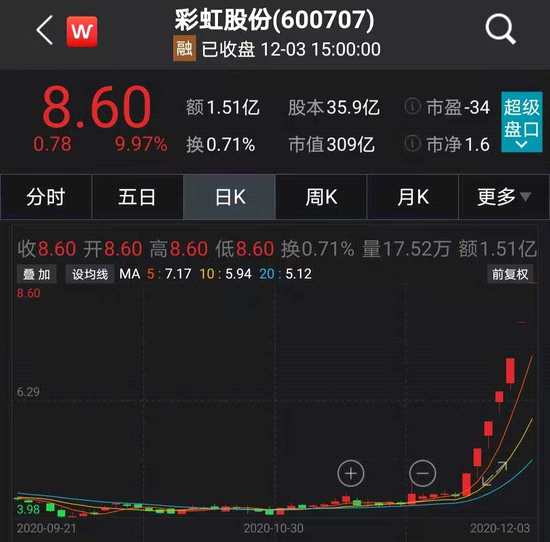 7天7板,股價翻倍,彩虹股份成為全場最耀眼的星。