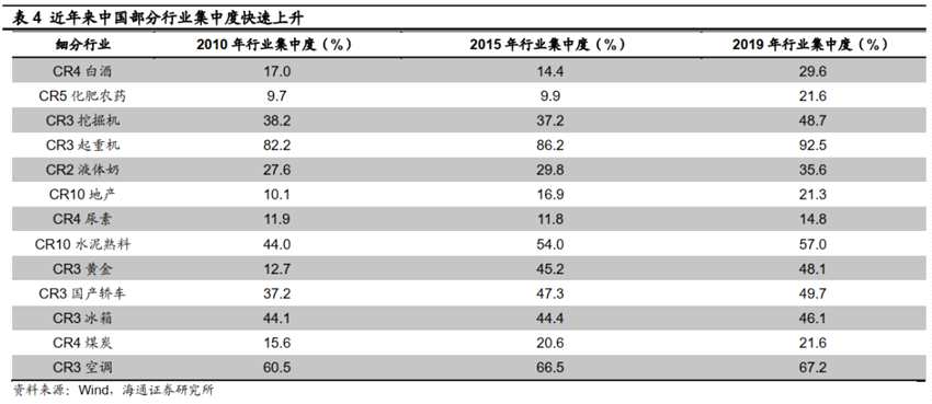 行業(yè)集中度反映了某行業(yè)內(nèi)頭部廠商產(chǎn)值或銷量等在市場(chǎng)份額的分布,集中度越高, 大廠商對(duì)市場(chǎng)的定價(jià)能力越強(qiáng)、對(duì)行業(yè)發(fā)展產(chǎn)生的影響越大,從而更有可能獲得超額利潤(rùn)。在經(jīng)濟(jì)發(fā)展過程中,隨著行業(yè)規(guī)模效應(yīng)的逐漸凸顯,大型頭部企業(yè)市場(chǎng)占有份額將不斷上升,從而出現(xiàn)各行業(yè)集中度上升的現(xiàn)象。當(dāng)前中國(guó)正處在產(chǎn)業(yè)結(jié)構(gòu)轉(zhuǎn)型期,經(jīng)濟(jì)發(fā)展目標(biāo)從追求速度向追求效益、規(guī)模和質(zhì)量轉(zhuǎn)變,隨著產(chǎn)權(quán)界定更加清晰、營(yíng)商環(huán)境更加優(yōu)化,資源配置的有效性將不斷增強(qiáng),各行業(yè)集中度也將迎來提升。