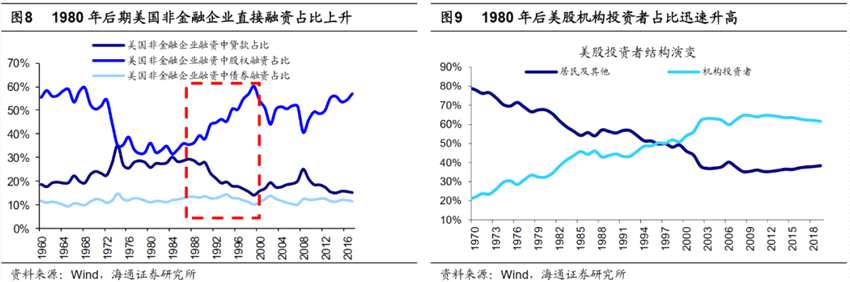 參考美國(guó),股權(quán)融資發(fā)展提升機(jī)構(gòu)投資者占比。前期報(bào)告《我們終將俯瞰現(xiàn)在——再論當(dāng)前中國(guó)類似1980年代美國(guó)-20191217》研究過,1980s年代美國(guó)股權(quán)投融資大發(fā)展催生了股市長(zhǎng)牛,整個(gè)社會(huì)非金融企業(yè)融資結(jié)構(gòu)中股權(quán)融資的占比從1985年的35%上升至2000年的60%。與此同時(shí),以養(yǎng)老金為代表的長(zhǎng)線資金也在1980年前后大量進(jìn)入股市。美國(guó)個(gè)人退休金賬戶(即 IRAs 計(jì)劃)及401K的推出使得美國(guó)養(yǎng)老金規(guī)??焖偕仙?,養(yǎng)老金入市的比例也隨之提高。大量長(zhǎng)線資金入市使得美股中機(jī)構(gòu)投資者占比從1970年的20%快速上升至2000年的63%。