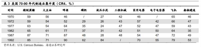 自1970年起美國(guó)經(jīng)濟(jì)開始轉(zhuǎn)型,各行業(yè)集中度均明顯提升,龍頭業(yè)績(jī)開始占優(yōu)。美國(guó)經(jīng)濟(jì)轉(zhuǎn)型主要表現(xiàn)為70-80年代以低端制造為代表的行業(yè)迎來快速發(fā)展,行業(yè)集中度上升,80-90年代家用電器、電子及機(jī)械制造等行業(yè)集中度上升。參考美國(guó)SIC四位數(shù)細(xì)分行業(yè),以各行業(yè)前4大企業(yè)出貨量計(jì)算的市場(chǎng)集中度為基準(zhǔn)(CR4),從1972到1982年,精制蔗糖從59%升至65%,大豆油從54%升至61%,啤酒從52%升至77%,磷肥從29%升至37%,液壓水泥從26%升至31%。從1982到1992年,美國(guó)電子、飛機(jī)等中高端制造行業(yè)迅猛發(fā)展,行業(yè)集中度呈現(xiàn)快速上升的態(tài)勢(shì)。其中工程機(jī)械從1982年42%升至1987年48%,家用電器從1982年51%升至1992年70%,電子電容器從50%升至55%,飛機(jī)從64%升至79%,船舶建造及修理從35%升至53%。隨著美國(guó)各行業(yè)集中度提升,各行業(yè)龍頭業(yè)績(jī)表現(xiàn)更強(qiáng),詳見圖5。
