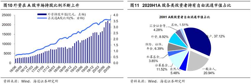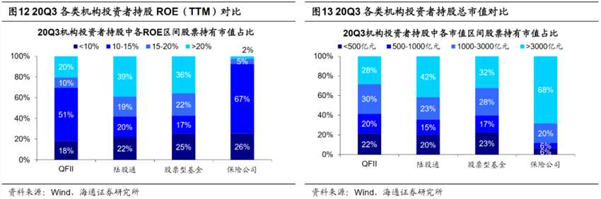 近年來我國(guó)內(nèi)外資機(jī)構(gòu)投資者占比上升,其更偏愛大市值績(jī)優(yōu)龍頭股。近年來,A股內(nèi)外資機(jī)構(gòu)投資者占比持續(xù)上升。從內(nèi)資看,A股機(jī)構(gòu)占比上升的長(zhǎng)期趨勢(shì)較為明顯,機(jī)構(gòu)投資者從2019Q1的18%上升到了2020H1的27%,而散戶投資者自由流通市值持股占比總體呈下降趨勢(shì),從2018Q3的43%下降到了2020H1的約37%。內(nèi)資邊際增量資金影響市場(chǎng)風(fēng)格,相對(duì)于散戶,機(jī)構(gòu)投資者投資行為更加理性,機(jī)構(gòu)投資持股占比提高將強(qiáng)化龍頭股效應(yīng)。從外資看,截至2020/11/25,A股外資占流通市值比例已經(jīng)從2016年的0.6%左右上升到了3.8%。外資持續(xù)流入鞏固龍頭地位,參考韓國(guó)和中國(guó)臺(tái)灣的歷史經(jīng)驗(yàn),外資在對(duì)新興市場(chǎng)的股票進(jìn)行配置時(shí),更偏好大盤藍(lán)籌股代表的行業(yè)龍頭。整體上,內(nèi)外資均偏好重點(diǎn)布局高ROE(TTM)和大市值公司:QFII在20Q3持有的ROE(TTM)在10%以上的股票市值占比為82%,陸股通北上資金為78%,股票型基金為75%,保險(xiǎn)公司為74%,而A股ROE為8.2%;QFII在20Q3持有的總市值在500億元以上的股票市值占比為78%,陸股通北上資金為80%,股票型基金為77%,保險(xiǎn)公司為94%,而A股市值中位數(shù)為58億元。具體到個(gè)股,這四類投資者重倉(cāng)最多的個(gè)股包括貴州茅臺(tái)、五糧液、美的集團(tuán)、愛爾眼科等龍頭??梢?,內(nèi)外資機(jī)構(gòu)投資者均更偏好業(yè)績(jī)好、市值更大的頭部公司。