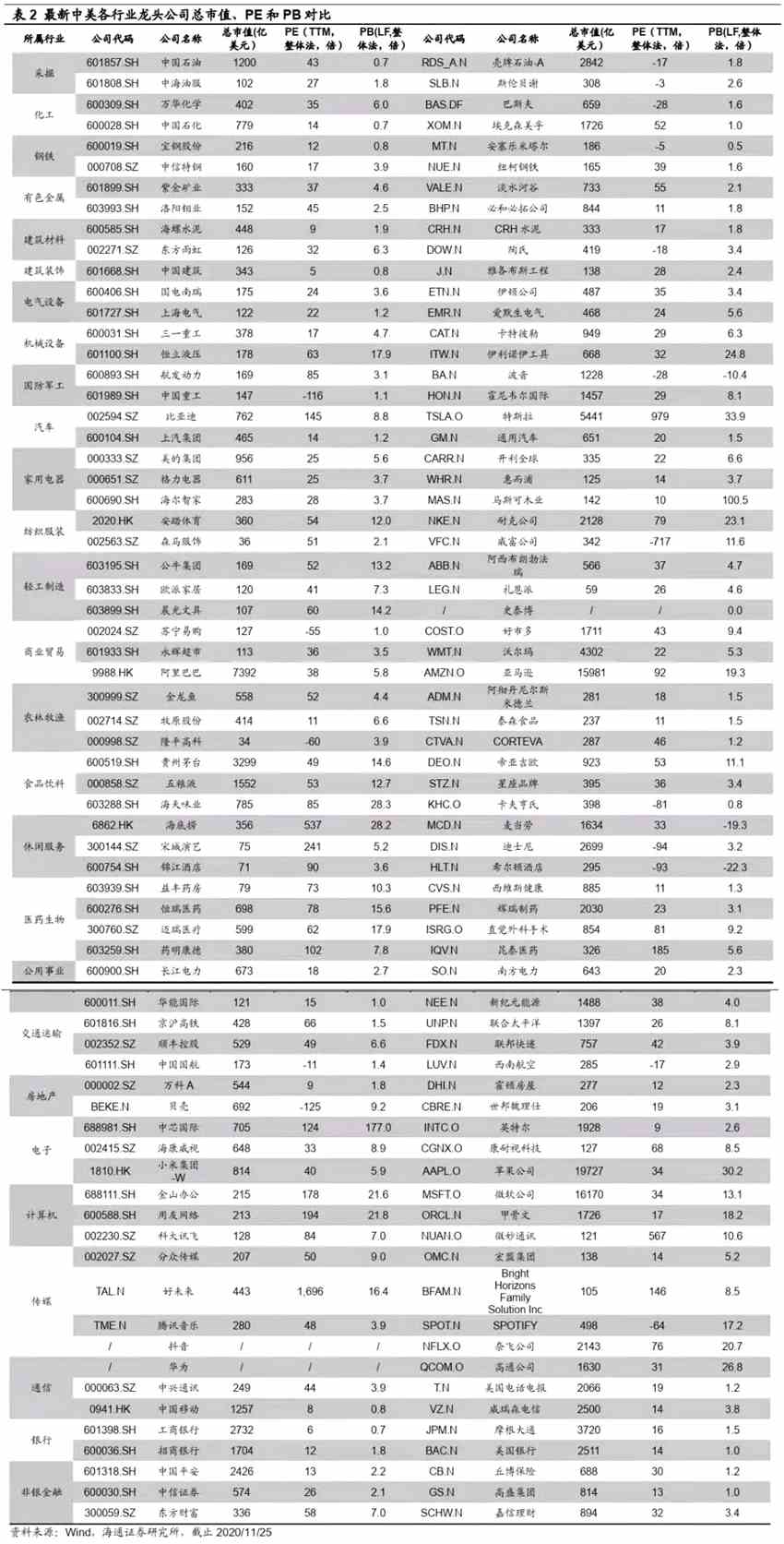 對(duì)比美國(guó),我國(guó)經(jīng)濟(jì)轉(zhuǎn)型方向行業(yè)龍頭還待長(zhǎng)大?;仡櫄v史,改革開放后我國(guó)依次經(jīng)歷了3輪產(chǎn)業(yè)結(jié)構(gòu)變革,不同經(jīng)濟(jì)發(fā)展時(shí)期主導(dǎo)行業(yè)各異,1990s年代日用消費(fèi)品騰飛,2000s年代工業(yè)化和地產(chǎn)鏈崛起,2010s年代新興消費(fèi)和高端制造發(fā)力。1990s和2000s年代經(jīng)濟(jì)主導(dǎo)產(chǎn)業(yè)中的龍頭公司日漸成熟,足以與美國(guó)同類媲美,比如家電、鋼鐵、地產(chǎn)、水泥等。截止2020/11/25,中/美家電龍頭美的集團(tuán)/開利全球總市值為956/335億美元,鋼鐵龍頭寶鋼股份/安賽樂米塔爾為216/186億美元,地產(chǎn)龍頭萬科A/霍頓房屋為544/277億美元,水泥龍頭海螺水泥/CRH水泥為448/333億美元。然而,2010s年代經(jīng)濟(jì)主導(dǎo)產(chǎn)業(yè)中的龍頭公司還正在長(zhǎng)大,與美國(guó)同行相比這些龍頭仍有較大成長(zhǎng)空間,比如科技、新能源車、創(chuàng)新藥、機(jī)械設(shè)備等。截止2020/11/25,中/美消費(fèi)電子龍頭小米集團(tuán)/蘋果公司總市值為814/19727億美元,新能源車龍頭比亞迪/特斯拉為762/5441億美元、創(chuàng)新藥龍頭恒瑞醫(yī)藥/輝瑞制藥為698/2030億美元,機(jī)械設(shè)備龍頭三一重工/卡特彼勒為378/949億美元。