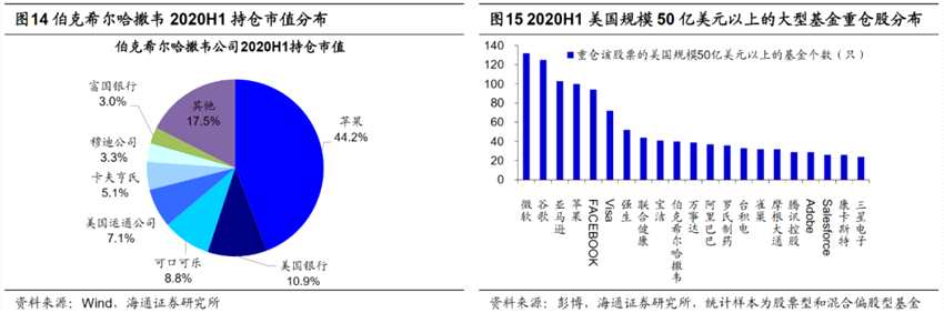 借鑒美國(guó),大型機(jī)構(gòu)投資者傾向于配置龍頭。參照美國(guó)經(jīng)驗(yàn),美國(guó)規(guī)模超50億美元以上的大型股票型基金重倉(cāng)最多的股票主要是微軟、蘋果、Visa、寶潔、摩根大通等各行業(yè)的龍頭公司,這些行業(yè)龍頭經(jīng)營(yíng)良好,能夠成為是大型基金業(yè)績(jī)的壓艙石。以伯克希爾哈撒韋公司在2020H1的持倉(cāng)分布為例,在其2024億美元的持倉(cāng)市值中,其持有蘋果公司、美國(guó)銀行、可口可樂、運(yùn)通公司、卡夫亨氏的市值占比分別為44.2%,10.9%、8.8%、7.1%、5.1%, 共計(jì)76.1%,可見美股市場(chǎng)中以伯克希爾·哈撒韋公司為代表的超大型機(jī)構(gòu)投資者持倉(cāng)結(jié)構(gòu)非常集中,更偏好持有業(yè)績(jī)穩(wěn)定的行業(yè)龍頭。