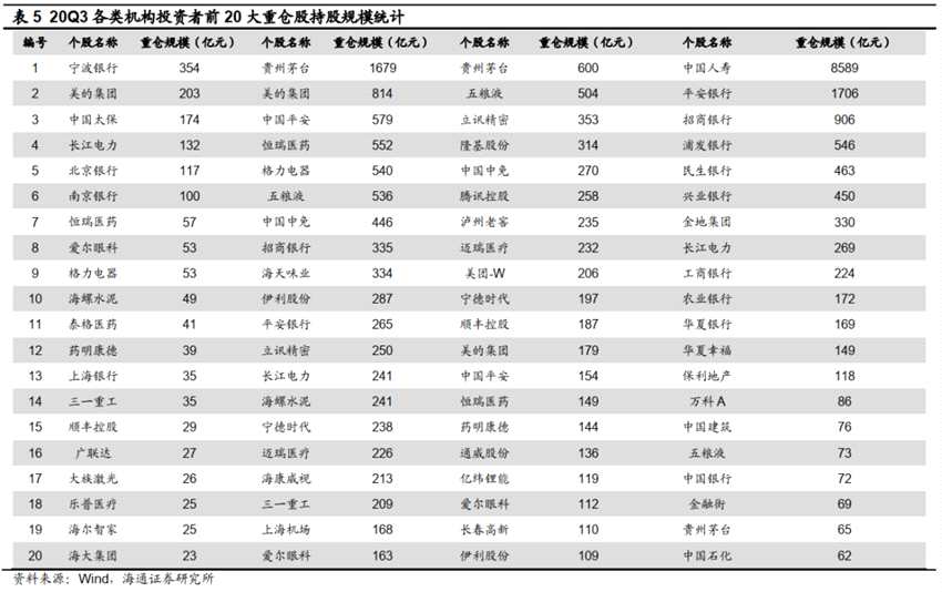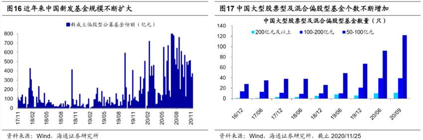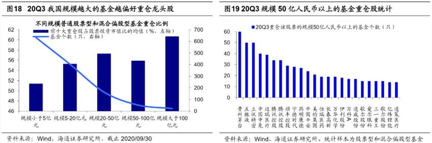 A股基金規(guī)模不斷擴(kuò)大,持倉(cāng)集中且偏好龍頭。公募基金是A股機(jī)構(gòu)投資者的主力,近年來公募基金總體規(guī)模不斷擴(kuò)張,爆款基金頻現(xiàn),單只基金規(guī)模持續(xù)擴(kuò)大,大型基金數(shù)量越來越多。截至2020Q3,規(guī)模為200億元及以上、100-200億元、50-100億元普通股票型基金和混合偏股型基金個(gè)數(shù)分別為11只、39只、122只,對(duì)應(yīng)的基金規(guī)模占比分別為12%、21%、36%,而50億元以下的基金多達(dá)2161只,基金規(guī)模占比僅為32%。這些活躍在A股市場(chǎng)上的大型機(jī)構(gòu)投資者,憑借著雄厚資金,擁有更強(qiáng)的定價(jià)能力。大型的頭部基金(或類似資管產(chǎn)品)往往偏好業(yè)績(jī)持續(xù)性更好和市值規(guī)模更大的龍頭股,這是因?yàn)榇笮突鹳Y金體量龐大,高昂的沖擊成本使得其更偏好大市值公司,同時(shí)大型基金對(duì)確定性要求更高,從而偏好業(yè)績(jī)持續(xù)性更好的公司。統(tǒng)計(jì)20Q3我國(guó)普通股票型和混合偏股型基金重倉(cāng)股,基金規(guī)模在100億元以上的基金前10大重倉(cāng)股持股市值占比均值為60.1%,50~100億元的基金為57.5%,20~50億元的基金為56.0%,5~20的基金為54.8%,小于5億元的基金為52.2%,可見我國(guó)基金規(guī)模越大,其持倉(cāng)結(jié)構(gòu)越集中,對(duì)龍頭公司的偏好更強(qiáng)烈。此外,我們還統(tǒng)計(jì)了20Q3我國(guó)規(guī)模在50億元以上的大型股票基金重倉(cāng)股,發(fā)現(xiàn)這些重倉(cāng)股基本都是各行業(yè)龍頭,包括五糧液、貴州茅臺(tái)、招商銀行、立訊精密、美的集團(tuán)、中國(guó)平安、恒瑞醫(yī)藥等??梢?,規(guī)模越大的主動(dòng)型基金持倉(cāng)結(jié)構(gòu)越集中,越偏向持有龍頭股。