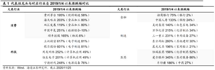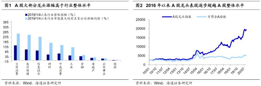 A股龍頭效應(yīng)凸顯,其股價(jià)表現(xiàn)領(lǐng)跑全行業(yè)。統(tǒng)計(jì)2019/01/04這輪牛市以來各行業(yè)市值最大前五家公司漲幅均值/行業(yè)漲幅,日常消費(fèi)為269%/149%,醫(yī)療保健為256%/108%,信息技術(shù)為237%/97%,材料為175%/56%,可選消費(fèi)為153%/66%,工業(yè)為130%/46%,金融為51%/39%,房地產(chǎn)為28%/22%,公用事業(yè)為17%/15%,能源為3%/-3%,可見大部分龍頭公司表現(xiàn)遠(yuǎn)遠(yuǎn)優(yōu)于行業(yè)整體水平。A股龍頭公司強(qiáng)者愈強(qiáng)的局面開始出現(xiàn),具體表現(xiàn)優(yōu)異的龍頭包括:白酒中的貴州茅臺(tái)、食品中的海天味業(yè)、快遞中的【順豐控股(002352)、股吧】,機(jī)械中的三一重工、醫(yī)藥中的愛爾眼科等,詳見下表1。拉長(zhǎng)視角來看,自2016年以來A股龍頭效應(yīng)開始顯著,我們編制了A股龍頭指數(shù),將中信一級(jí)行業(yè)市值最大的前三家公司作為成分股,按照自由流通市值進(jìn)行加權(quán),計(jì)算得到2016年以來龍頭指數(shù)漲幅為180%,而萬得全A為2%,A股龍頭公司表現(xiàn)非常優(yōu)異。