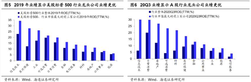 我國(guó)行業(yè)集中度提升始于2010年,自此龍頭業(yè)績(jī)優(yōu)勢(shì)逐步顯現(xiàn)。自2010年開始中國(guó)部分行業(yè)集中度進(jìn)入快速提升階段,2010-2015年期間黃金CR3從12.7%升至45.2%,國(guó)產(chǎn)轎車從37.2%升至47.3%,水泥從44.0%升至54.0%,地產(chǎn)CR10從10.1%升至16.9%,煤炭從15.6%升至20.6%。2015年底供給側(cè)改革提出“三去一降一補(bǔ)”,進(jìn)一步促進(jìn)了部分消費(fèi)和制造業(yè)行業(yè)集中度進(jìn)一步提升,2015-2019年期間白酒CR4從14.4%升至29.6%,化肥農(nóng)藥從9.9%升至21.6%,起重機(jī)CR3從86.2%升至92.5%,液體奶CR2從29.8%升至35.6%,尿素從11.8%升至14.8%,冰箱從44.4%升至46.1%。隨著行業(yè)集中度提升,龍頭公司占據(jù)更大市場(chǎng)份額,從而業(yè)績(jī)表現(xiàn)更優(yōu)異。對(duì)比20Q3各行業(yè)市值最大的前三家公司和行業(yè)整體ROE,我們發(fā)現(xiàn)龍頭公司業(yè)績(jī)整體高于行業(yè)水平,詳見下圖6。