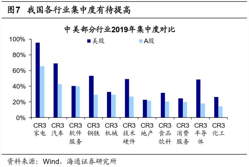 對(duì)比美國(guó),我國(guó)多數(shù)行業(yè)集中度還有較大提升空間。我們以各行業(yè)前3大頭部公司營(yíng)收占比來衡量行業(yè)集中度,得到2019年中/美家電CR3為66%/96%,汽車與汽車零部件為43%/69%,軟件與服務(wù)為39%/40%,鋼鐵為29%/53%,工業(yè)機(jī)械為29%/32%,技術(shù)硬件與設(shè)備為27%/49%,地產(chǎn)為22%/23%,食品飲料為20%/31%,消費(fèi)者服務(wù)為20%/25%,半導(dǎo)體與生產(chǎn)設(shè)備為18%/48%,化工為14%/26%。基本上美股大多數(shù)行業(yè)集中度均高于我國(guó)。但是,需要注意的是,由于美股傳統(tǒng)行業(yè)上市公司數(shù)量較少,比如中/美地產(chǎn)上市公司共計(jì)428/213家,鋼鐵上市公司共計(jì)71/20家,家用電器69/7家,所以這種CR3計(jì)算方法可能低估A股傳統(tǒng)行業(yè)的龍頭地位。比如,2019年中/美地產(chǎn)龍頭萬科A/霍頓房屋營(yíng)收為528/176億元,鋼鐵龍頭寶鋼股份/紐柯鋼鐵為417/226億美元,家電龍頭美的集團(tuán)/開利全球?yàn)?98/186億美元,在這些行業(yè)我國(guó)龍頭公司盈利能力遠(yuǎn)超美國(guó)。結(jié)合以上分析,我國(guó)部分傳統(tǒng)優(yōu)勢(shì)行業(yè)如地產(chǎn)、家電等行業(yè)集中度和美國(guó)差不多,但是大部分行業(yè)集中度還比較低,未來還有較大提升空間。