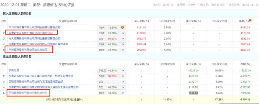 12月3日以4652.7萬(wàn)元位列賣(mài)出第三席位的東莞證券股份有限公司北京分公司,在12月1日買(mǎi)入2629.02萬(wàn)元,位列買(mǎi)入第五席位;賣(mài)出1845.53萬(wàn)元,位列賣(mài)出第五席位。