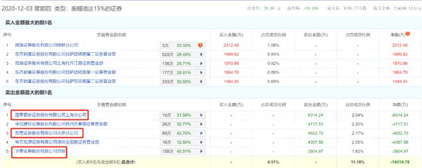 國(guó)泰君安證券股份有限公司上海分公司在12月1日和12月2日分別買(mǎi)入4179.8萬(wàn)元和7468.8萬(wàn)元,位列當(dāng)日買(mǎi)入第二和第一席位。而在12月3日大肆賣(mài)出6314.24萬(wàn)元。