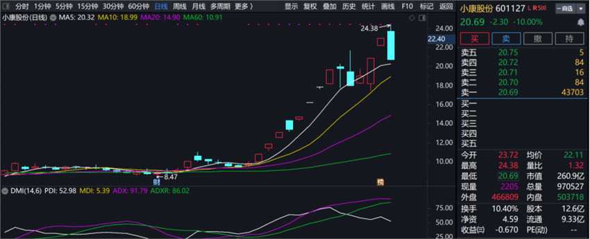 12月3日,15個(gè)交易日股價(jià)最高漲幅148.27%的新能源汽車(chē)小康股份收盤(pán)跌停。無(wú)獨(dú)有偶,長(zhǎng)安汽車(chē)當(dāng)日也大跌7.68%。前兩日還大量買(mǎi)入的游資12月3日開(kāi)始大肆出貨,長(zhǎng)安汽車(chē)還遭深股通席位凈賣(mài)出3.11億元。