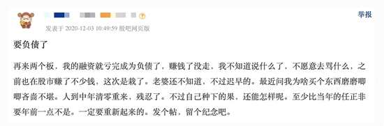 有不少股東今日在股吧表示,已經(jīng)跌到爆倉。有股民稱,再來兩個跌停融資虧完成負(fù)債了;有股民哭訴辛辛苦苦好多年,一夜回到解放前;還有股民無奈問舉報有沒有用。