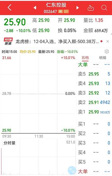 12月4日,仁東控股一字跌停。截至收盤,股價報25.9元/股,換手率為0.05%,封單183.8萬手,這已經(jīng)是仁東控股連續(xù)的第8個跌停。10個交易日前,仁東控股的股價創(chuàng)歷史新高,當(dāng)日最高市值超360億元,而如今的仁東控股市值僅為145億元,10個交易日跌去超200億市值。