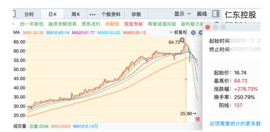 10個交易日前,仁東控股還是今年的“大牛股”。今年開盤以來至11月20日,仁東控股走出了“45度仰望星空”的走勢,累計漲幅高達278.73%,市值翻了近3倍。當(dāng)時有網(wǎng)友調(diào)侃:“走勢比茅臺還穩(wěn)、K線畫得比貨幣基金還漂亮”。