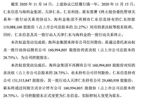 ??平鸺瘓F雖未持有仁東控股任何股份,但通過委托表決權(quán)及一致行動協(xié)議擁有1.61億股股份的表決權(quán)(占上市公司總股本的28.75%),成為公司控股股東,公司實控人變更為北京市海淀區(qū)國資委。該協(xié)議履行滿一年后,2020年11月15日,海科金集團不再擁有仁東控股表決權(quán)。公司控股股東正式變更為仁東信息,實際控制人變更為霍東。