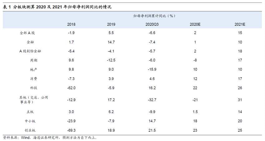 牛市在途,21年基本面+情緒面驅(qū)動(dòng)。18年底、19年底時(shí)我們先后發(fā)布報(bào)告《穿越黑暗迎黎明——2019年A股投資策略-20181209》、《“?!鞭D(zhuǎn)乾坤——2020年A股投資策略-20191117》,分別指出牛市將要來臨以及牛市仍在途中,2019年1月4日上證綜指2440點(diǎn)為第六輪牛市的起點(diǎn)。至今市場仍然處在牛市格局中,具體表現(xiàn)有三:大部分寬基指數(shù)漲幅明顯、大部分個(gè)股漲幅明顯、場外資金大量入市。在做出牛市格局的判斷之后,我們在《牛市有三個(gè)階段-20190303》等報(bào)告中基于資金面、基本面、情緒面的變化,將牛市進(jìn)一步細(xì)化為孕育期、爆發(fā)期、泡沫期三個(gè)階段。我們認(rèn)為2019年市場整體處在由資金面驅(qū)動(dòng)的牛市孕育期,宏觀上十年期國債利率從18年日均的3.62%下降到19年日均的3.18%,降低超過40個(gè)bp,指數(shù)上漲與盈利的相關(guān)性并不大,比如創(chuàng)業(yè)板指與中小板指成分股19年的歸母凈利潤同比增速分別為13%和-1%,但是指數(shù)的漲幅均超過了40%。2020年市場進(jìn)入了基本面和資金面雙輪驅(qū)動(dòng)的牛市爆發(fā)期,各大指數(shù)的漲跌幅差異與基本面差異基本一一對應(yīng):創(chuàng)業(yè)板指、滬深300與上證綜指成分股20Q3歸母凈利潤累計(jì)同比增幅依次為27%、-8%、-11%,指數(shù)的漲幅也是依次遞減,年初至今(截至2020/12/04)分別漲52%、24%和13%。展望21年,隨著宏觀經(jīng)濟(jì)復(fù)蘇至正常水平,宏觀政策也將逐步調(diào)整,牛市也將從20年的爆發(fā)期轉(zhuǎn)變?yōu)?1年由基本面和情緒面驅(qū)動(dòng)的泡沫期,明年股市將是“股”舞人心的一年,詳細(xì)分析見我們近期發(fā)布的年度策略報(bào)告《“股”舞人心——2021年中國股市展望-20201127》。