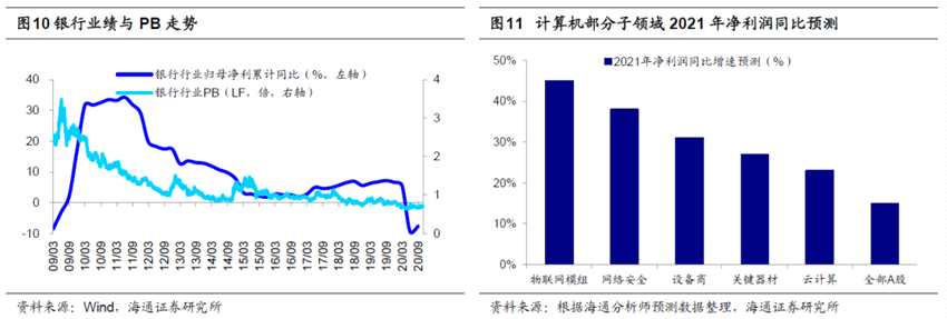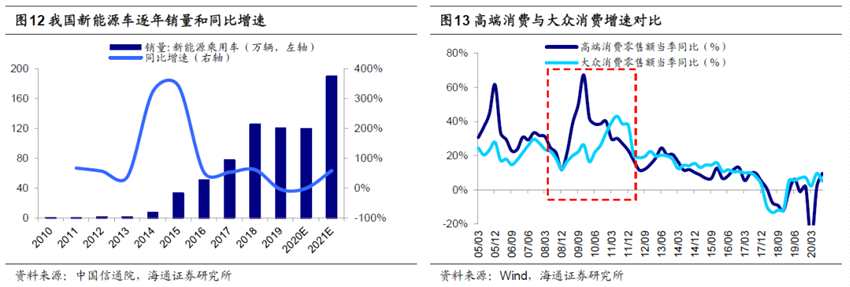 明年行業(yè)配置的第二梯隊(duì)是內(nèi)需:“十四五”規(guī)劃《建議》再次強(qiáng)調(diào)構(gòu)建“雙循環(huán)”新發(fā)展格局,提出形成強(qiáng)大國內(nèi)市場,將擴(kuò)大內(nèi)需作為戰(zhàn)略基點(diǎn)。展望明年,大眾消費(fèi)有望崛起。回顧08年金融危機(jī)歷史經(jīng)驗(yàn),貨幣寬松、四萬億等刺激政策推出后,高收入人群首先受益,08Q4-09Q2城鎮(zhèn)居民人均可支配收入增速分別高于農(nóng)村居民家庭人均現(xiàn)金收入增速的6.0%/1.6%/1.9%,這一階段汽車、家電等耐用消費(fèi)和高端白酒等可選消費(fèi)行業(yè)需求旺盛,珠寶、化妝品、汽車等高端消費(fèi)增速迅速上升;09Q3起隨著基建、房地產(chǎn)投資落地和制造業(yè)、服務(wù)業(yè)用工需求擴(kuò)張,農(nóng)村居民收入增速逐漸超過城鎮(zhèn)居民,糧油、食品、飲料等大眾消費(fèi)增速順勢崛起。今年以來,城鎮(zhèn)居民收入受到疫情的影響較小,而農(nóng)村居民特別是外出務(wù)工者收入受沖擊較大,20Q3城鎮(zhèn)居民人均可支配收入同比增5.4%,高于農(nóng)村外出務(wù)工勞動(dòng)力月均收入增速3.3%,因此今年可選消費(fèi)品中汽車和高端白酒表現(xiàn)亮眼。借鑒09-10年經(jīng)驗(yàn),預(yù)計(jì)乳制品、餐飲、超市等大眾消費(fèi)需求或?qū)⒋笤?。此外,隨著收入水平的增加和健康意識(shí)的提升,預(yù)計(jì)專科醫(yī)院、高端醫(yī)療器械、醫(yī)療美容、養(yǎng)生保健等醫(yī)療服務(wù)領(lǐng)域需求也有望提升。