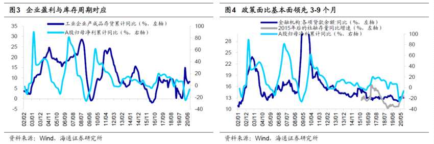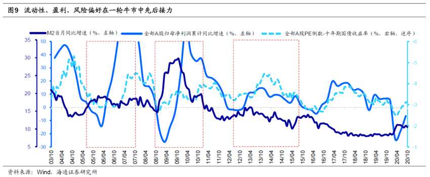 過去牛市到頭均對應(yīng)基本面頂部,目前基本面仍在回升中。除了擔(dān)憂連續(xù)兩年高漲幅的問題,部分投資者還擔(dān)憂,由于今年Q1基本面被疫情砸出“深坑”,低基數(shù)效應(yīng)下明年全部A股歸母凈利潤同比增速的高點(diǎn)將在21Q1,明年基本面將因此逐季度依次下滑,市場承壓。我們認(rèn)為對明年基本面拐點(diǎn)的判斷要剔除低基數(shù)的影響,即應(yīng)當(dāng)看全部A股歸母凈利潤累計(jì)的同比增速或者ROE(TTM)。我們預(yù)計(jì)A股凈利累計(jì)同比增速將持續(xù)回升至2021年3季度,ROE持續(xù)回升至2021年Q4,因此牛市還在路上。推測的依據(jù)一是依據(jù)庫存周期,本輪補(bǔ)庫存周期原本從19年11月啟動(dòng),期間疫情有所擾動(dòng),歷史上一輪庫存周期平均持續(xù)21個(gè)月,依次推斷這次補(bǔ)庫存將持續(xù)至21Q3;二是政策時(shí)滯,歷史上政策面領(lǐng)先基本面3-9個(gè)月,我們預(yù)計(jì)這次寬松政策退出的轉(zhuǎn)折點(diǎn)可能在21年一季度末二季度初,對應(yīng)盈利高點(diǎn)21Q3前后?;仡櫄v史,過去牛市的頂點(diǎn)均對應(yīng)全部A股歸母凈利潤累計(jì)同比和ROE高點(diǎn):