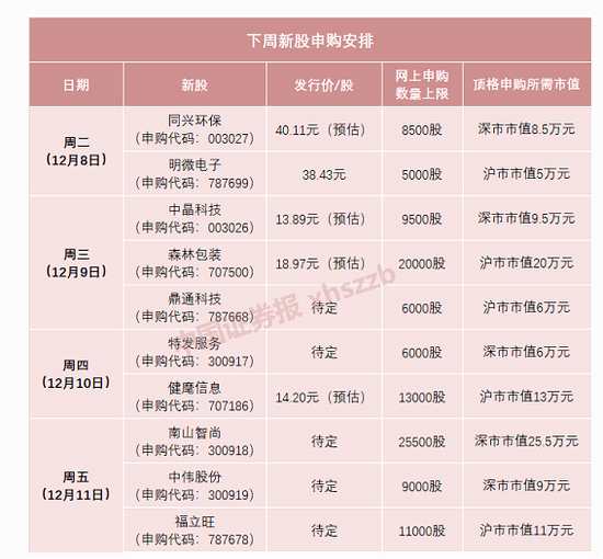 下周10只新股中,有6只頂格申購所需市值不足十萬元,分別是下周二的同興環(huán)保和明微電子、下周三的中晶科技和鼎通科技、下周四的特發(fā)服務(wù)、下周五的中偉股份。有條件的投資者可以嘗試頂格申購,以提高中簽概率。