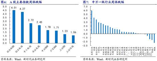 上周A股有所上漲,其中創(chuàng)業(yè)板50(4.51%)、創(chuàng)業(yè)板指(4.27%)領(lǐng)漲。申萬(wàn)一級(jí)行業(yè)中,醫(yī)藥生物(5.98%)、傳媒(4.14%)和食品飲料(3.68%)領(lǐng)漲,鋼鐵(-2.30%)和房地產(chǎn)(-1.56%)領(lǐng)跌。概念股中,打板指數(shù)(12.96%)、血液制品指數(shù)(8.28%)和觸摸屏指數(shù)(7.07%)領(lǐng)漲,充電樁指數(shù)(-3.94%)、炭黑指數(shù)(-3.93%)和房屋租賃指數(shù)(-2.67%)領(lǐng)跌。