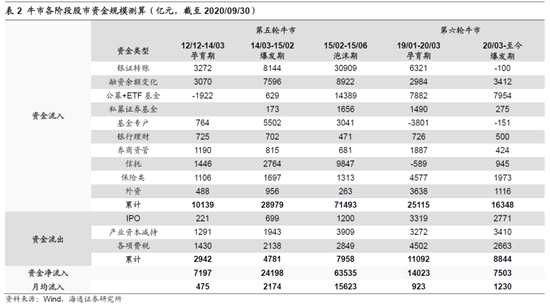 ?、?9年以來的牛市月度資金凈流入1000億元:上證綜指19年1月4日的2440點(diǎn)是第六輪牛市的起點(diǎn),至今市場走勢雖有波折,但整體處在中樞向上的牛市中。從資金面上看,19年初至20三季度末股市資金凈流入2.1萬億,月均流入約1000億元。