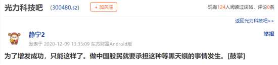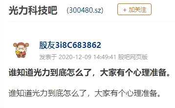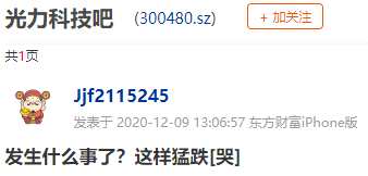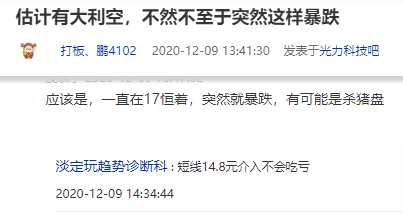 從股吧中,不少投資者猜測可能與近期光力科技宣布定向增發(fā)有關(guān),這一猜測的邏輯是,股價下跌之后,定增投資者才能以更低的股價參與增發(fā),后續(xù)獲利也會更高: