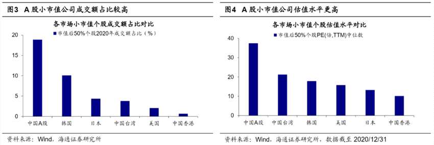 退市制度不完善導(dǎo)致A股小市值個(gè)股大量積聚。過去A股退市制度不健全,退市指標(biāo)設(shè)置不合理,退市流程漫長且低效,導(dǎo)致本應(yīng)退市的公司無法有效出清,這些公司逐漸被邊緣化而產(chǎn)生大量小市值公司。相對(duì)海外市場(chǎng),A股小市值公司成交額占比偏高,以2020/12/31的市值進(jìn)行劃分,市值后50%的個(gè)股2020年成交額占比達(dá)18.9%,美股和港股作為成熟市場(chǎng)僅為2.0%和0.7%,臺(tái)股為3.8%,日股為4.3 %,韓股為10.1%。同時(shí),A股小市值公司估值也高于海外市場(chǎng),市值后50%個(gè)股PE(TTM)中位數(shù)為37.5倍,港股僅為10.1倍,日股為13.2倍,美股為15.8倍,韓股為17.9倍,臺(tái)股為21.3倍??梢?,A股退市制度缺位導(dǎo)致部分小市值公司占用較多的市場(chǎng)資源。