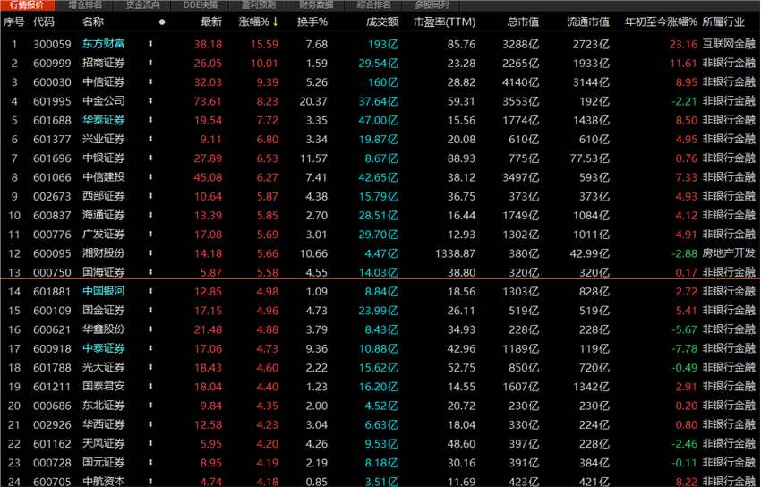 今日,券商板塊尾盤拉升,券商概念指數(shù)大漲6.27%。50只券商概念股中,有49只上漲,其中13只個股漲幅超過5%。股民直呼“券商一身吼,嚇得空頭抖一抖”。券商股吹起了市場上攻的號角?