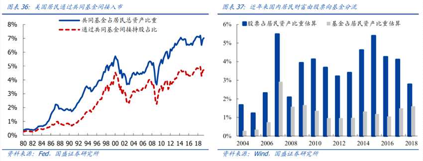未來通過機(jī)構(gòu)入市將成為居民權(quán)益投資的主要方式。從美國的實(shí)踐來看,居民通過養(yǎng)老金配置共同基金,進(jìn)而實(shí)現(xiàn)對股票資產(chǎn)的間接配置,是美國居民成為“資本家”的主要途徑:在對共同基金和養(yǎng)老金所持有的資產(chǎn)進(jìn)行穿透后,大致可得當(dāng)前美國居民資產(chǎn)中,間接持有的股票比重高達(dá)18.5%,已然高于直接持有的14.1%的比重。