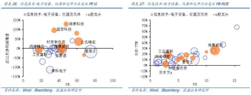 1)PE-G或PB-ROE下估值具備優(yōu)勢的行業(yè)有:電子設(shè)備、儀器和元件、電信服務(wù);