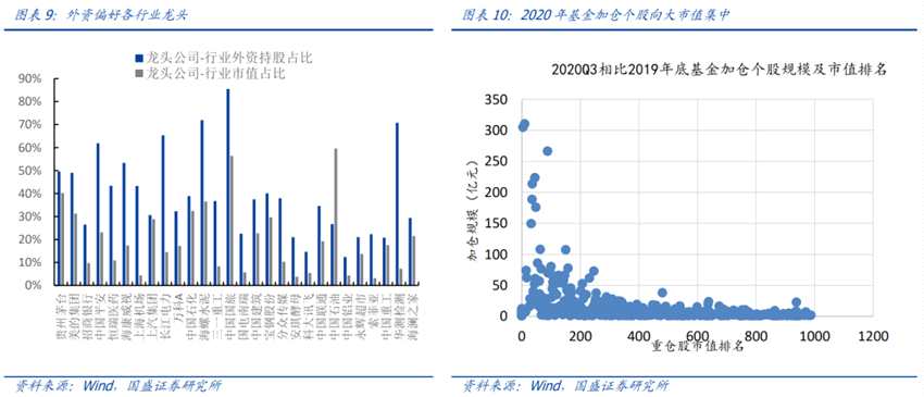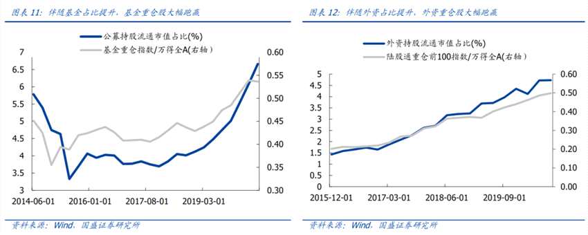 外資與公募共同推動A股機(jī)構(gòu)化進(jìn)程加速,外資與公募重倉的龍頭股大幅跑贏市場。外資占比與陸股通重倉股相對收益高度相關(guān),外資從2017年大幅流入,成為A股市場最重要增量資金,外資重倉龍頭持續(xù)跑贏。2019年以來基金崛起,成為市場主導(dǎo)資金,基金話語權(quán)快速提升,帶來基金重倉股大幅跑贏大盤。