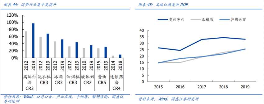 消費(fèi)行業(yè)行業(yè)集中度提升,龍頭地位穩(wěn)固。消費(fèi)龍頭憑借品牌效應(yīng)贏得市場,行業(yè)集中度逐漸提升。以白酒行業(yè)為例,高端白酒龍頭地位穩(wěn)固,占據(jù)龐大份額的同時保持高ROE。當(dāng)前高端白酒CR3占據(jù)了超過95%的市場份額,龍頭地位日益穩(wěn)固, ROE維持高位。