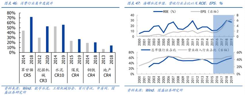 周期行業(yè)集中度亦明顯提升,傳統(tǒng)周期龍頭盈利穿越周期。供給側(cè)改革驅(qū)動下,新增產(chǎn)能的擴(kuò)張受抑制,中小企業(yè)加速出清,龍頭占據(jù)更大的市場份額。以水泥行業(yè)為例,行業(yè)整合加速下,以海螺水泥為代表的行業(yè)龍頭市占率擴(kuò)大,ROE與EPS也隨之實(shí)現(xiàn)高速增長。