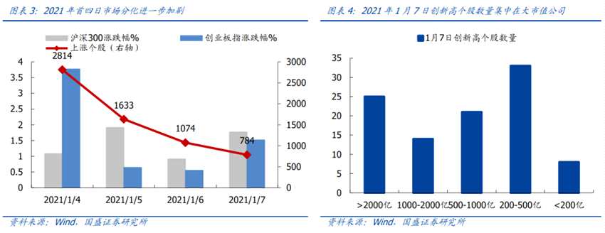 2021年首周,市場分化進(jìn)一步加劇,“A股漲出了股災(zāi)的感覺”,被稱為“股災(zāi)牛”,資金加速抱團(tuán)龍頭個股。1月4日-8日,上證指數(shù)、滬深300、創(chuàng)業(yè)板指等主要市場指數(shù)在權(quán)重股帶領(lǐng)下不斷創(chuàng)新高,但全市場上漲股票個數(shù)從2814只縮減至784只,并且1月7日當(dāng)天仍有101只個股創(chuàng)歷史新高,且集中在各行業(yè)龍頭個股,超過2000億市值的超大龍頭公司占比達(dá)到25%。與龍頭大放異彩形成強(qiáng)烈對比,大部分個股跌幅慘重。