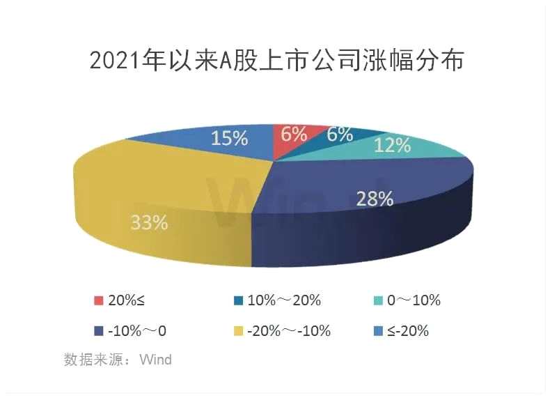 從今年全部A股以來漲幅情況來看,有233只個股漲幅超過20%,占比6%;有241只個股漲幅在10%到20%之間,占比6%;492只個股漲幅在10%以內(nèi),占比12%。此外有3100多只個股今年下跌,占比76%;同時跌幅超過10%的個股高達48%,接近半數(shù)。