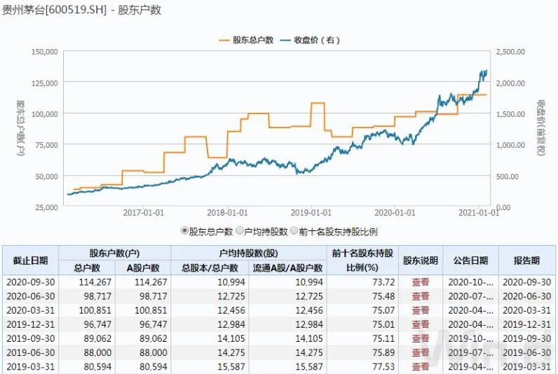抱團股成為當前市場的熱門話題,那到底是機構(gòu)抱團還是散戶抱團呢?以屢創(chuàng)新高的貴州茅臺為例,截至2月3日收盤,公司股價上漲2.09%報收于2189.91元,再度逼近2200元。